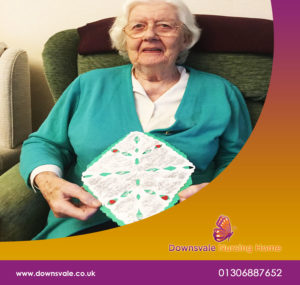 A resident choosing her designs for personalised christmas card and many other activities @ Downsvale Nursing Home in Dorking. Specialist Nursing and Dementia care and community for the elderly in Dorking, Surrey. ????????
